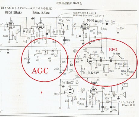 ![]() 右図でA3には平均値AGC,SSBには尖頭値AGCを使いわけ BFOには流通角制御方式を採用したとの事です。 尚 AGCラインに負電圧を重畳するゲイン調節方式でした。 |