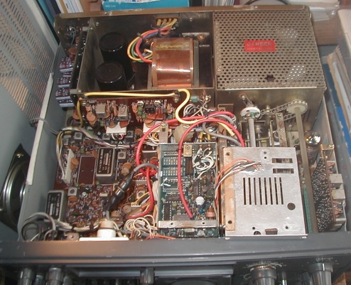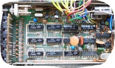 FT-101ZD 後期型のカウンター 真ん中 下に 見える長方形のICが高集積ICのカウンター素子です。 丁度VFOの上側に配置した基板に周辺回路も組み込んだユニットになっています。 原理は旧型と同じで プリミックスユニットの出力周波数(ローカル信号)をカウントしていますがアルゴリズムは不明です。 モードの選択により連動してプリセットする値を決めている様です。 このICは八重洲オリジナルの物らしく故障したら交換不可能です。 代替の部品として個人の方が開発された物が有るらしいですが。 |