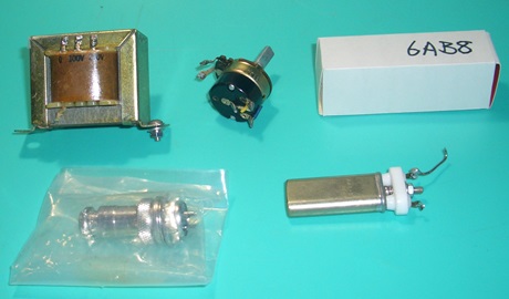 JR-500Sの改造部品の一部です。 左端のトランスはVFO回路用の低電圧電源を作る為のもので AC100V入力 12V出力の仕様です。 VRは電源SW兼音量調節用、6AB8は6BM8を交換します。 左下の部品は電源コードを直付けからコネクター方式に 変更する為の3芯コネです。 水晶片は100KC/Sでキャリブレーター用。 |